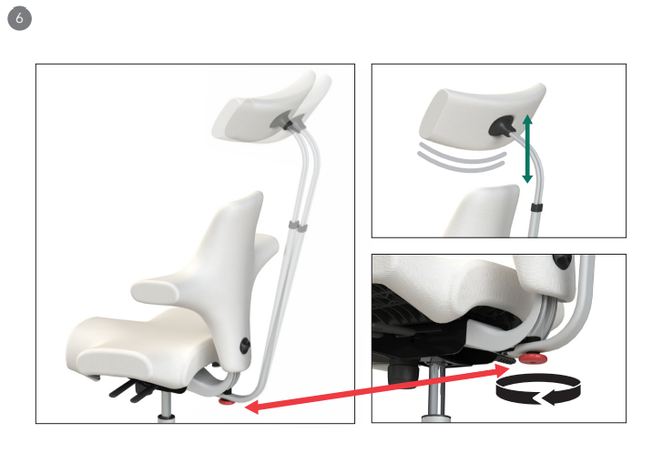 Adjust the distance using the knob underneath. Adjust the height by sliding the headrest up or down along the rod. You are set up correctly when your head is lightly supported, without pushing your head forward.