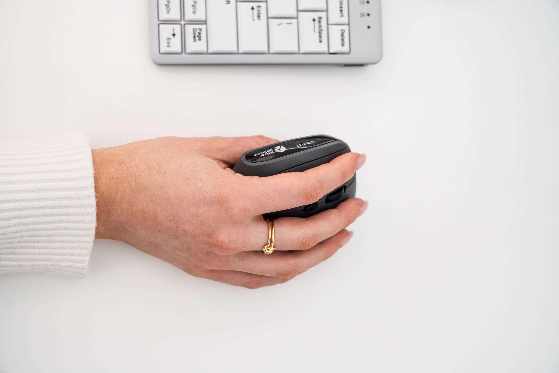 La MidWay est une petite souris mobile avec un angle ergonomique subtil. Ta main repose plus naturellement qu’avec une souris plate, tout en gardant une manipulation familière. Beaucoup de gens trouvent que cela aide à travailler plus confortablement, surtout lors de longues journées. Tu te connectes rapidement via bluetooth, dongle ou câble et tu passes facilement d’un appareil à l’autre.