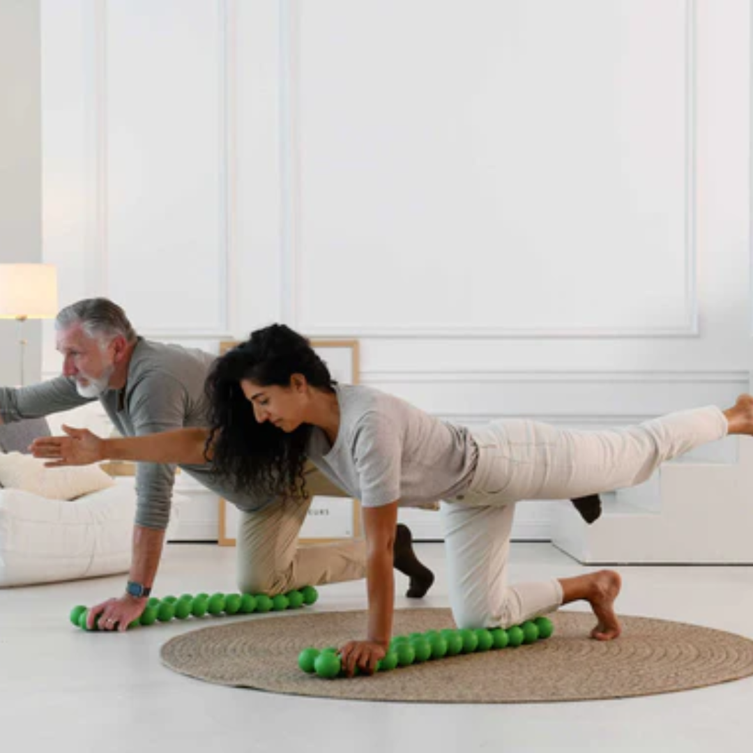 De dubbele balstructuur stimuleert de spieren langs de wervelkolom en helpt je lichaam opnieuw in balans te brengen.
